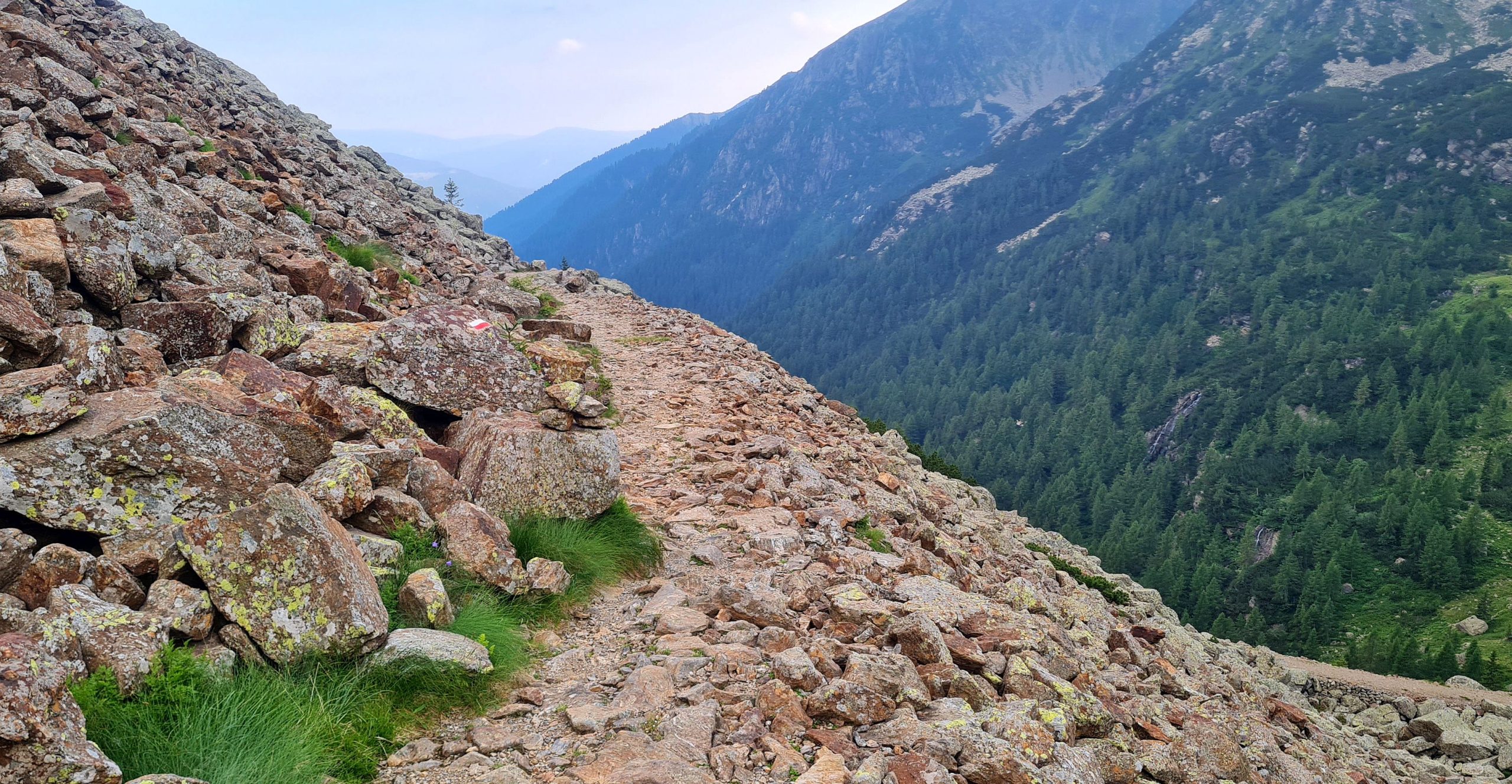 Von der Passhöhe lässt sich das gesamte Tal hinab bis Pieve Tesino überblicken, da es sehr geradlinig verläuft. Die ersten Abfahrtskilometer sehen von oben sehr breit und einfach fahrbar aus. Steigt man dann auf den Sattel und fährt los, stellen sich die ersten Trailkilometer dann zwar als weitgehend fahrbar, aber doch teils felsdurchsetzt heraus, da mehrere Blockhalden durchquert werden. Innerhalb dieser ist der Wanderweg zwar sehr gut ausgebaut und gepflegt, doch kein „Flowtrail“ im engeren Sinne.