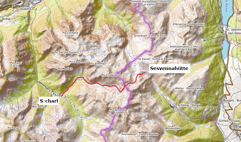 Talorte: 🇨🇭 S-charl (1807 m), 🇮🇹 Sesvennahütte (2258 m)