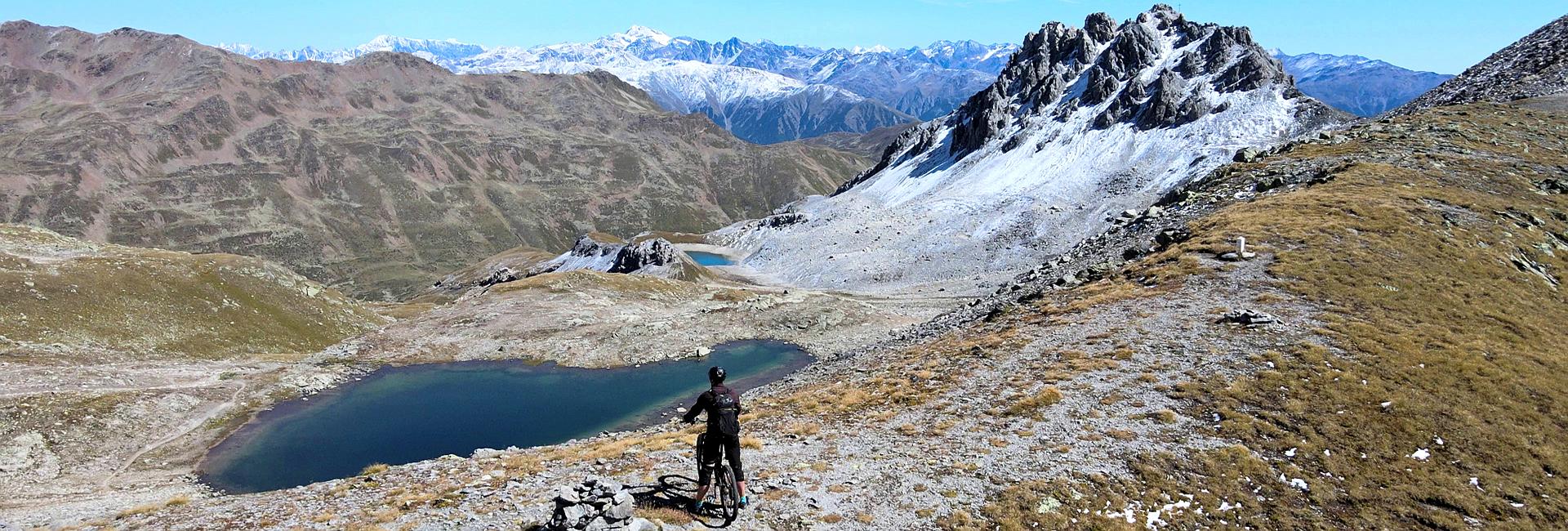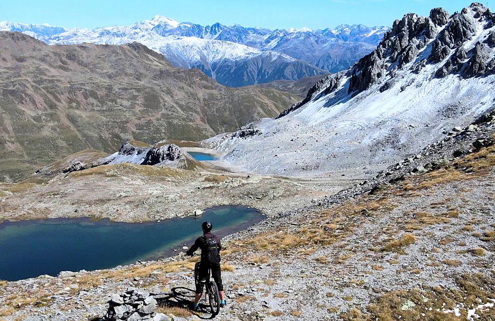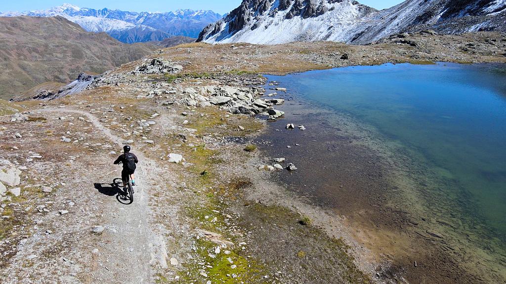 Die Hochebene endet abrupt nach knapp 2 Streckenkilometern an einer „Wand“, die kaum den weiteren Wegverlauf erkennen lässt. Hier muss in einem felsdurchsetzten Hang mit viel Geröll das Bike überwiegend bergauf getragen werden. Der nur rund 300 m lange Abschnitt überbrückt gut 140 Höhenmeter, bevor sich das Gelände unmittelbar vor dem kleinen Gletschersee in 2660 m Höhe abflacht. Ab hier ist auch die Fuorcola Sesvenna zu erahnen, und die letzten 850 Streckenmeter mit 160 Höhenmetern Anstieg lassen sich teils fahrend (wer in dieser Höhe noch kann), teils schiebend bewältigen.