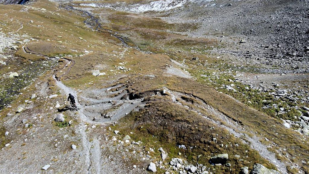 Der Verlauf des Abfahrtsweges ist bis zum Rand des Furkelsees bereits zu sehen. Sie ist zu Beginn vollständig fahrbar, im oberen Bereich mit viel Geröll noch im S3-Bereich, aber bald einfacher und ab dem Furkelsee sogar sehr flowig. Das Gelände fällt konsequent in Richtung der Sesvennahütte ab, und mit ihr der nur 2,7 km kurze und 560 Höhenmeter umfassende Abfahrtstrail. Einzelne Abschnitte mit viel Geröll sollten aus Sicherheitsgründen (Absturzgefahr zur Seite!) besser kurz geschoben werden. Es eröffnet sich ein weiter Ausblick über das Hochtal des Schlinigpasses, in Richtung der Uinaschlucht. Obwohl das dortige Gelände sehr einfach aussieht, zieht der Wanderweg konsequent ostwärts in Richtung der Sesvennahütte, wobei ein kleiner Sattel vor einem markanten Buckel umrundet wird. Hier beginnt die Alm um die Sesvennahütte, in der der Wanderweg die letzten 850 Streckenmeter absteigt. Dieser Abschnitt wird durch das ausgetretene Wiesengelände mit vielen Felsen zum Schluss etwas müßig, hier lässt sich kaum fahren. Da die 🏠 Sesvennahütte jedoch bereits in Sicht ist, ist dieses letzte Schiebestück erträglich.